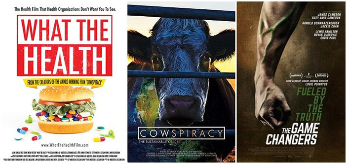 1) 몸을 죽이는 자본의 밥상 (What The Health) 2) 소에 대한 음모 (Cowspiracy) 3) 더 게임 체인저스(The Game Changers)