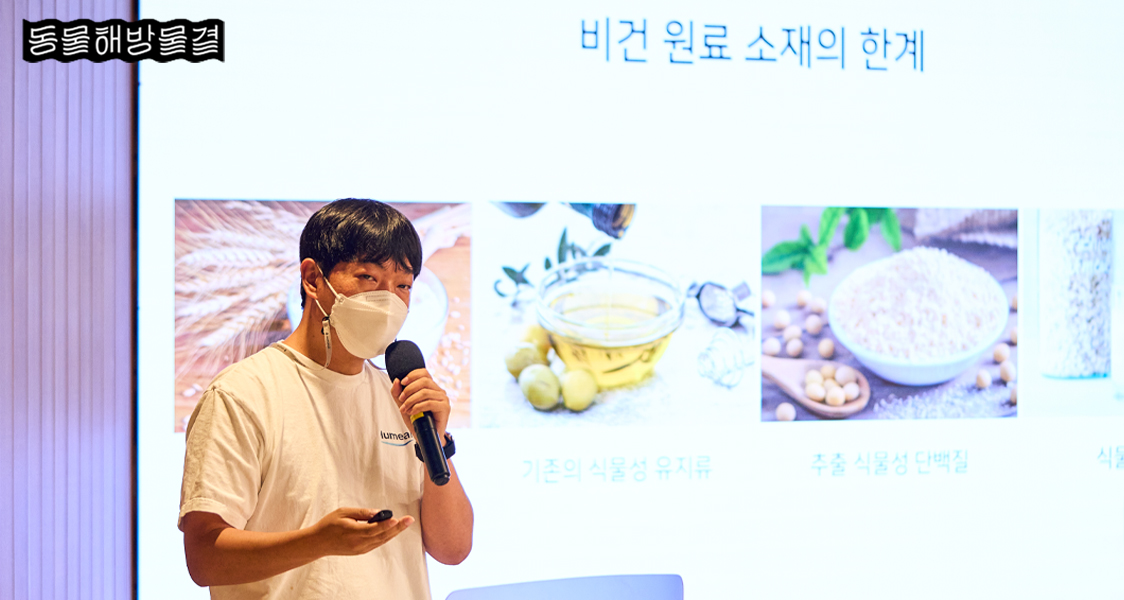 다음으로 김경환 ‘휴밀’ 대표의 발표가 이어졌는데요. 발표 주제는 ‘비건 원료 소재 기술로 시대가 원하는 제품을 만들다’였습니다. 휴밀은 비건 밀크 파우더 브랜드 ‘가루선생’을 만들어 운영하고 있습니다. 고유 특허 기술인 분말 두유 제조 기술을 활용해 비건 음료, 스프, 그래놀라 등을 제조하여 판매 중이라고 해요.