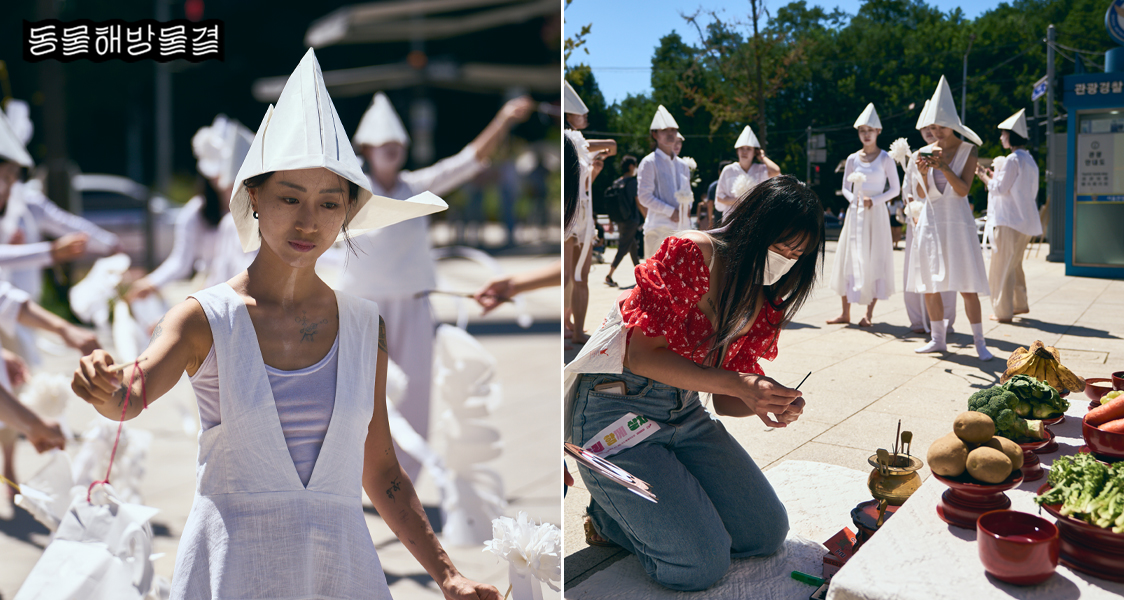 오후 1시 30분부터는 비건 무당 홍칼리님과 12명의 퍼포머들이 함께한 ‘죽어간 동물들을 기억하며’ 진혼춤 퍼포먼스가 펼쳐졌는데요. 퍼포머들이 하얀 화선지로 만든 동물 넋전과 종이 국화를 들고 춤을 추고, 참여자들은 광장 한 편에 마련된 제사상에서 애도하는 시간을 가졌어요. 인간과 달리 비인간동물의 넋을 기리는 진혼굿은 흔치 않다고 하는데요. 서울 동물권 행진에 모인 모두가 죽어간 동물들을 위해 함께 애도하고 연대할 수 있는 뜻깊은 시간이었습니다.