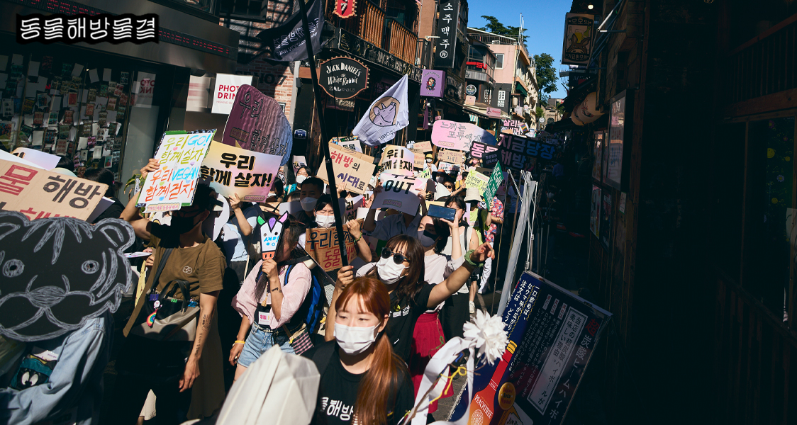호레이의 신나는 연주에 맞춰 이태원 세계 음식의 거리를 행진할 때는 우리들의 목소리가 더 멀리 울려 퍼지도록 크게 소리쳤어요. 동물의 사체를 파는 음식점이 즐비한 곳을 지나며, “우리 함께 살자”를 목놓아 외칠 때 느낀 전율이 아직까지도 기억에 남는데요. 동물 해방을 염원하는 우리의 존재를 여실히 드러낸 뜻깊은 순간이었어요. 행진을 마친 후 광장으로 돌아와 단체 사진을 찍고, 함께해준 서로에게 감사의 인사를 나누었답니다.