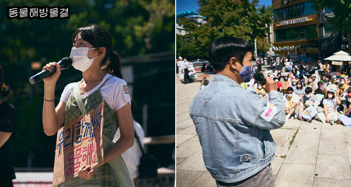 진혼춤 퍼포먼스가 끝나고 참여자들의 자유발언이 이어졌어요. 참여자들은 종차별이 만연한 세상에서 느끼는 분노와 슬픔을 토해내며, 각자가 꿈꾸는 종평등한 세상의 이야기를 전해주었어요. 우리들의 간절한 목소리가 점차 확산되어 모든 동물이 함께 살아가는 세상이 하루빨리 앞당겨지길 바라요.