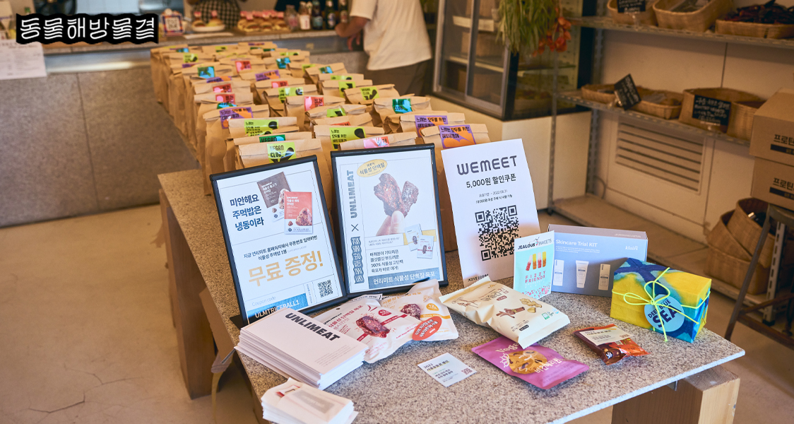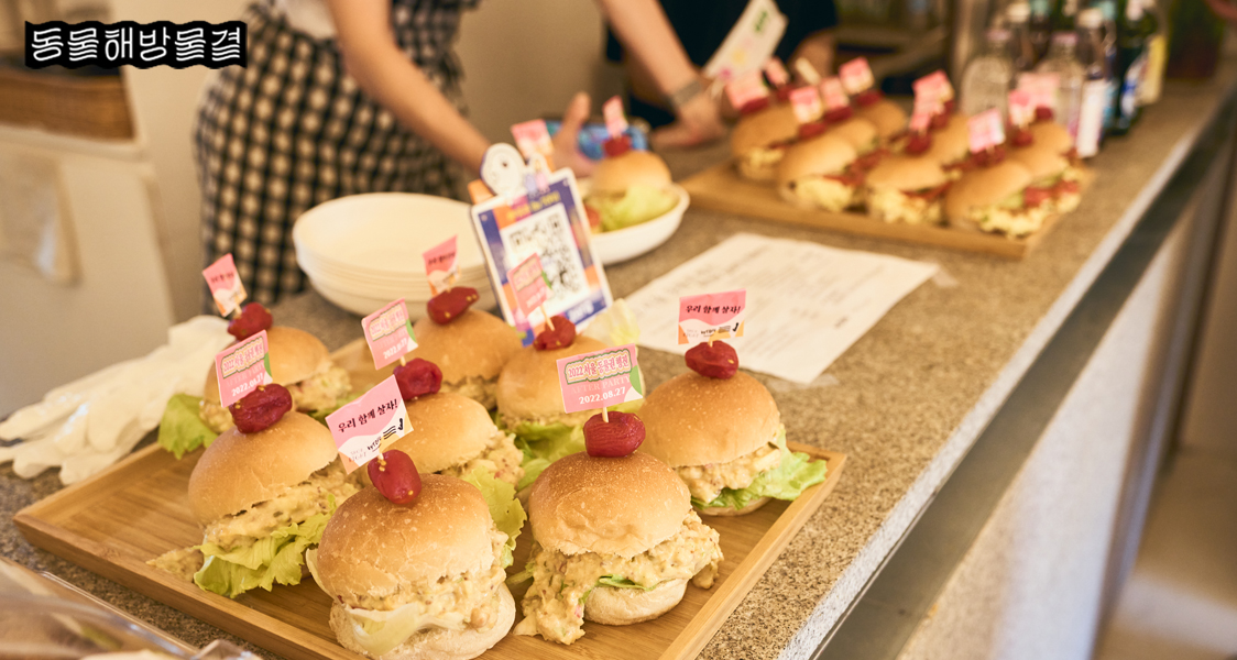 2022 서울 동물권 행진을 마치고 해방촌에 위치한 흠마켓(hmmmarket)에서 애프터파티를 진행했는데요! 비건 커뮤니티 비건클럽과 함께 열심히 기획하고 준비했습니다. 이번 애프터파티를 위해 이팅더즈매터, 언리미트, 위미트, 스위트이츠, 얄라, 바로 비건 밀키트, 올가니카, 클레어스, 러쉬 총 8개 기업에서 다양한 제품을 협찬해주셨습니다. 풍성한 협찬 덕에 참여자 모두에게 선물을 아낌없이 나눠드릴 수 있었답니다. 즐거운 파티에 음악과 음식이 빠질 수 없죠? 비건 DJ 채(Chae)의 신나는 음악에 바이두부와 샵라이트에서 준비해주신 비건 샌드위치와 음료가 더해지니 파티가 순식간에 더 흥겨워졌어요.