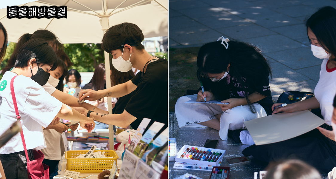 서울 동물권 행진이 열리는 녹사평역 광장에서는 오후 1시부터 다채로운 부대 행사가 시작됐는데요. 참여자들이 동물 부채 피켓에 메시지를 적어 꾸미고, ‘우린 모두 동물이다’, ‘보여줄게 비건 파워’ 등의 문구가 적힌 타투스티커를 활용해 개성 있는 퍼레이드 룩을 꾸몄어요. 서울 동물권 행진을 위해 “우리의 비건 파워를 보여주겠다!” 하는 마음이 엿보이는 순간이었답니다. 바로 옆에서는 비건클럽 굿즈와 두루미 출판사 책 판매, 꽃풀소 살림 프로젝트의 후원 부스도 운영됐어요.