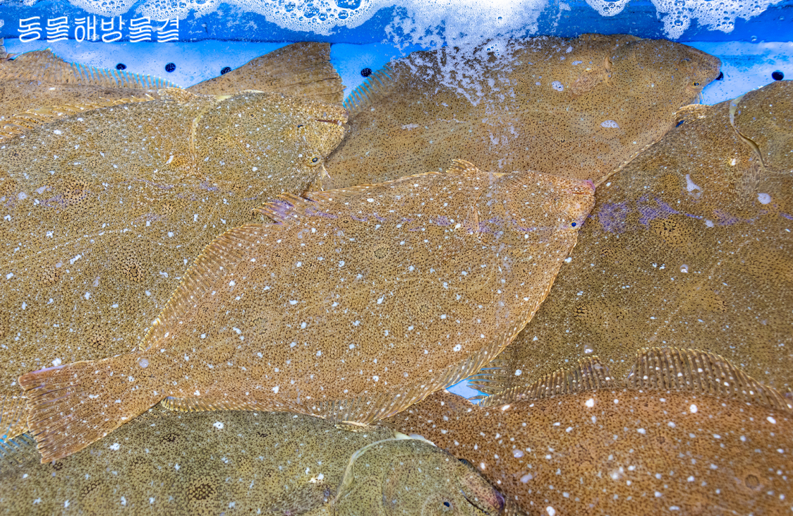 횟집 앞 넙치의 몸은 겹겹이 쌓여 수조를 채웁니다. 벽에 얼굴을 들이미는 넙치의 배에 얼룩덜룩한 무늬가 있습니다. 바다에 사는 넙치는 배가 새하얗지만, 양식장에서 길러지는 넙치의 배는 그렇지 않습니다. 움직이기 어렵고, 자신의 몸을 숨길 수 없는 수조에서 스트레스를 받는다는 점이 흑화 현상을 일으킬 가능성이 높다고 밝혀졌습니다.