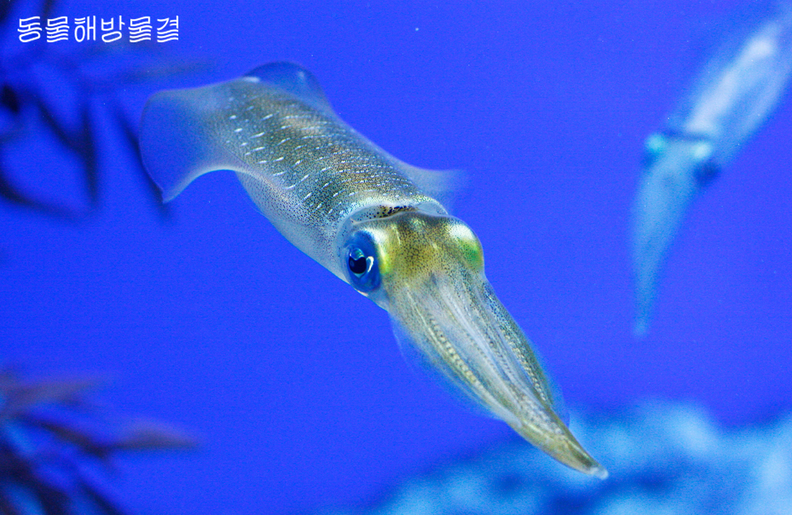 우주를 닮은 깊은 암흑의 바닷속 오징어는 신비로운 외계 생명체를 연상시킵니다. 유연한 오징어의 몸은 뼈 없이도 정교하게 움직입니다. 길쭉한 모자처럼 생긴 몸 안에는 심장, 창자, 먹물주머니 등의 장기들이 있으며, 그 중 심장은 3개로 구성됩니다. 머리에 발이 달려 ‘두족류’라 불리며, 다리 8개와 팔의 기능에 가까운 촉완 2개로 이루어져있습니다.