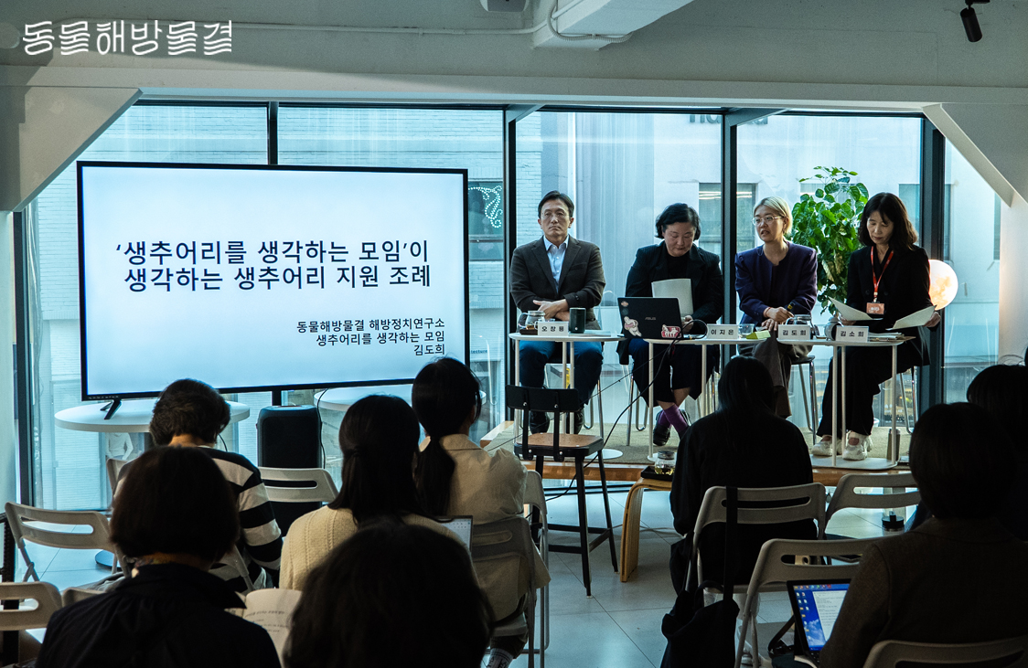 10월 11일,아트스페이스 서촌에서 재단법인 이다가 주최한 포럼 “생추어리, 모두의 공존을 위하여”가 개최되었습니다. 해당 포럼의 2부는 “생추어리 조례 제정을 위한 합의와 전망”이라는 주제를 바탕으로, 생추어리(*보금자리)의 국제적 입법 및 정책 동향과 국내 다양한 보금자리 현장의 목소리를 나누는 자리였는데요. 김도희 해방정치연구소장은 2부의 토론자로 참석하여 ‘생추어리를 생각하는 모임(생생모)’의 활동을 소개했어요. 현장에는 공간이 부족할 정도로 많은 분들이 참석해 보금자리에 대한 뜨거운 관심을 보여주었습니다.