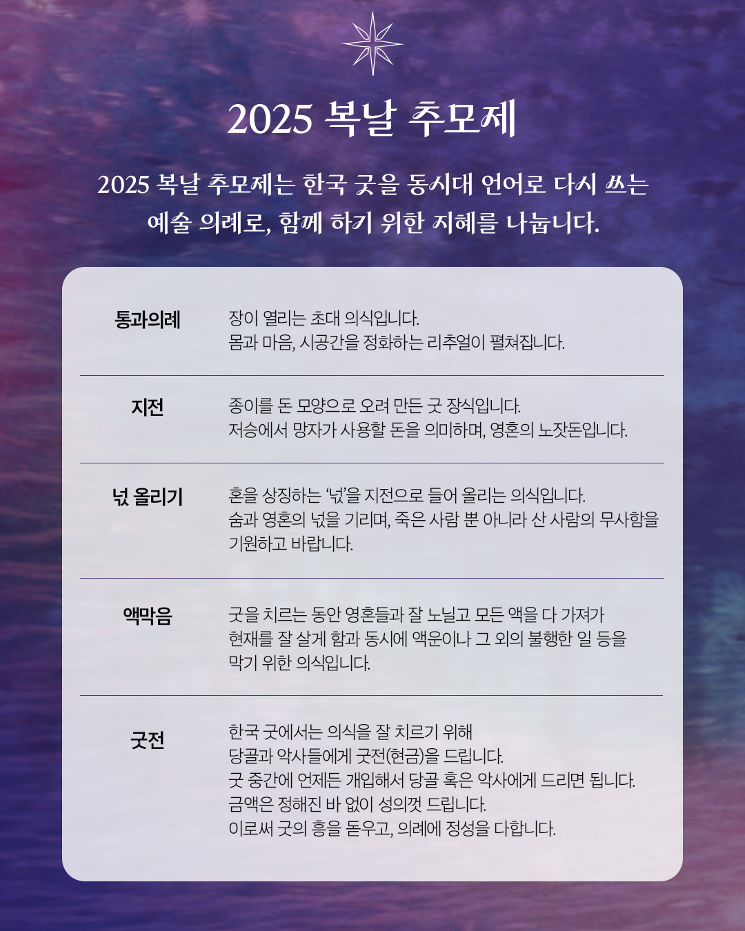 <2025 복날 추모제>는 한국 굿의 전통을 동시대 언어로 다시 부르는 문화예술 의례로 펼쳐집니다. 1인 시위 춤인 정진우의 <몸의 소리>로 문을 열고, 이세승 안무의 살(煞)이 ‘살’이 되는 <백의 춤>에서 시민들과 함께 몸짓을 나눕니다.