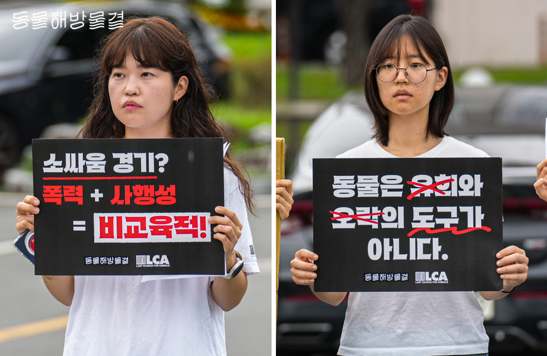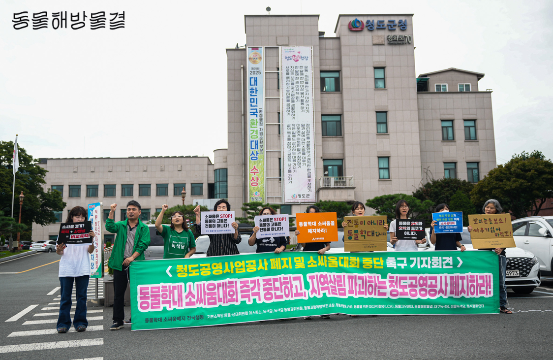 9월 15일 월요일, 동물해방물결은 청도군청 앞에서 공동 기자회견을 열고 소싸움경기를 전담하는 청도공영사업공사 폐지와 민속 소싸움대회 중단을 촉구했습니다.