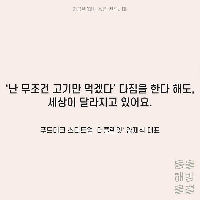 “동물성 단백질을 대체하는 식품은 거부할 수 없는 메가 트렌드가 될 거라고 생각했어요. 인터넷이나 모바일 사용과 같은 거예요. 우리가 아무리 인터넷을 하지 않으려 해도 모든 환경이 인터넷 기반으로 바뀌었잖아요. 아무리 거부한다 해도 사용할 수밖에 없는 어쩔 수 없는 환경이 된 거죠.” (더플랜잇 양재식 대표)