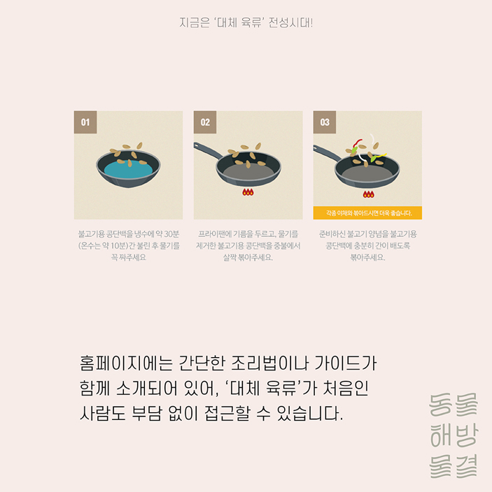 함께할수록 쉬워지는 탈육식, 혹시 ‘고기’가 너무 좋아서 시작하지 못하셨나요? 그렇다면 오늘, ‘대체 육류’부터 시작해보는 건 어떨까요?