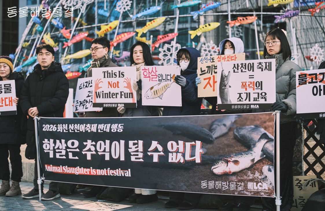 2026년 1월 7일 오전 11시, 동물해방물결은 화천 산천어축제 홍보 조형물이 설치된 한국프레스센터 앞에서 기자회견을 진행했습니다. 20여 명의 시민 활동가와 함께 화천군과 정부의 즉각적인 대응을 촉구하며 목소리를 높였는데요. 산천어축제의 폭력성을 알리기 위해 “새해부터 시작하는 생명학살”, “아이들은 폭력을 배웁니다”, “산천어도 살고싶다” 등 직접 제작한 피켓들을 현장에 전시하기도 했습니다.