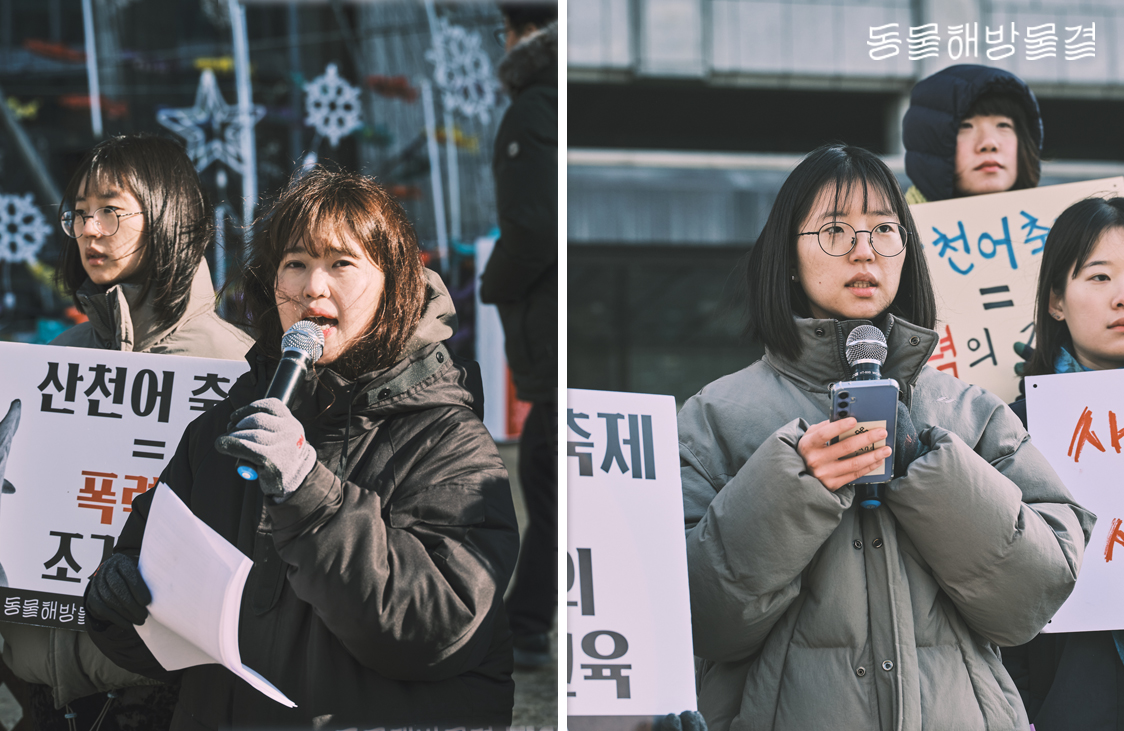 연대 발언에 참여한 김민선 넓적한물살이 활동가는 “화천 산천어축제는 결코 자연스럽지 않은 삶과 죽임이 매년 반복되는 곳”이라며, “강을 억지로 메꿔 흐르지 못하도록 숨통을 끊어놓고, 수십 수백만 산천어를 억지로 태어나고 자라게 해 죽이는 생태 학살의 현장”이라고 비판했습니다.